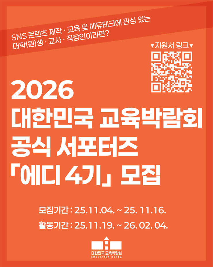 23년의 역사와 전통을 자랑하는 국내 최초·아시아 최대 규모의 교육·에듀테크 전문 박람회, 대한민국 교육박람회와 함께할 홍보 서포터즈 ‘에디’ 4기 요원을 찾습니다!
